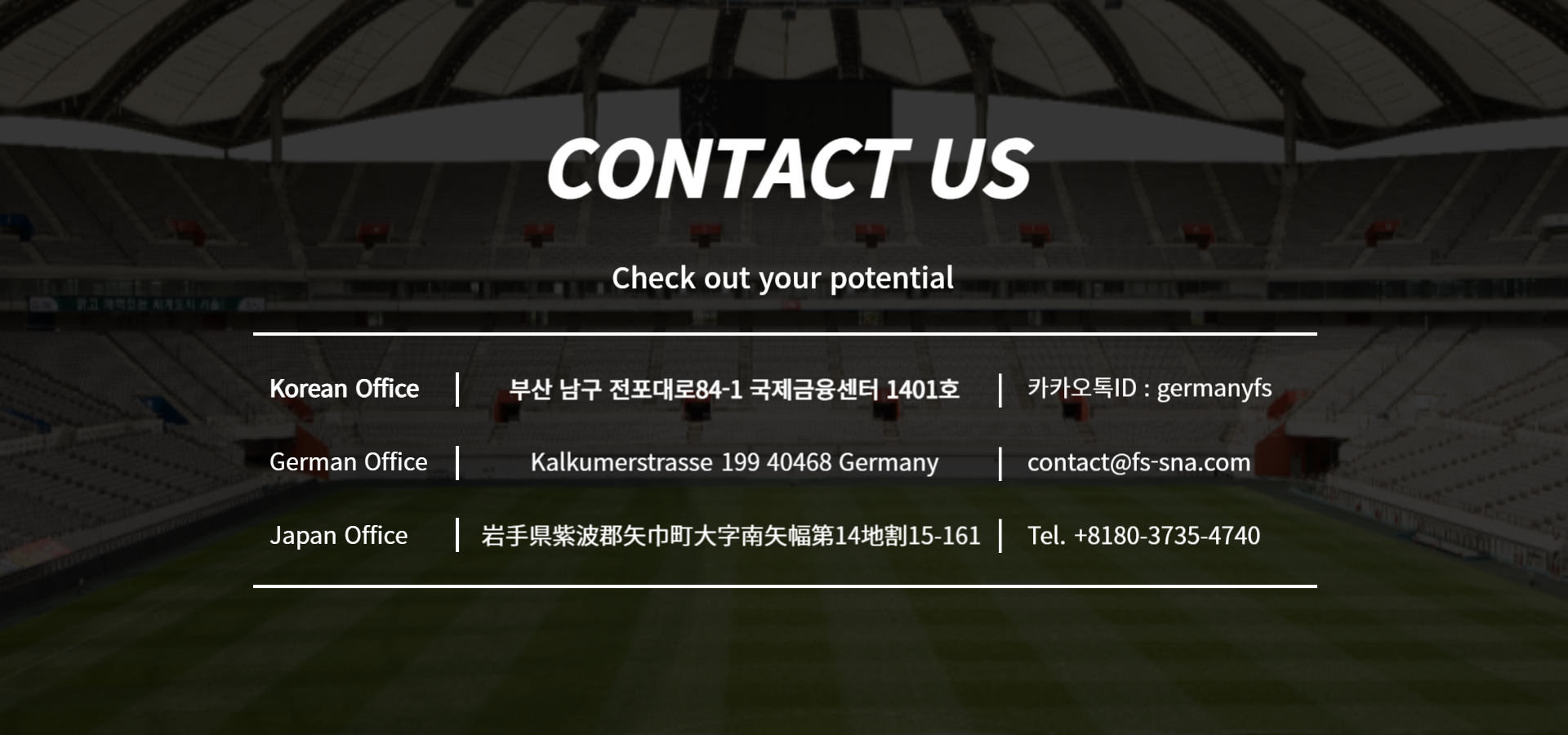 전문 독일축구유학의 선두주자 FS스포츠 축구 유학-축구 에이전시-축구 아카데미 산업의 선진화, 세계화를 목표로 독일에서 5년 이상의 경력을 쌓은 전문가를 중심으로 구성된 회사입니다. 기존의 열약한 매니지먼트 구조 환경에서 벗어나 그동안 쌓아 온 노하우와 시스템을 바탕으로 글로벌 시대에 맞추어 빠르게 변화하고 있는 독일 축구시장에서, FS S&A만의 색깔로 축구 선수들의 불편함 해소 그리고 진출을 위해 최선을 다할 것입니다. 전문성을 기반으로 한 법률, 의료행정처리와 축구 매니지먼트를 통하여 세계에서 인정 . . . 뛰어난 행정능력 비자, 거주, 학업, 이적, 선수 등록 등 축구 유학의 핵심 행정 능력을 책임집니다. 전문가 협업, 효율 증대 독일 선수생활과 학업의 효율 증대를 위한 각 분야 전문가 업무 분업을 시행 중입니다. 철저한 관리와 서포트 베타버전 애플리케이션 시행을 통한 선수 중요 서류, 학업성적, 식단, 학교 출석, 훈련 출석 확인이 가능합니다. 과정을 통한 결과 한국 아마추어 선수를 독일에서 직접 훈련, 양성하여 수차례 독일 프로 진출을 이뤘습니다. 신뢰를 기반으로 한 FS스포츠 현재 독일에는 무수히 많은 축구 에이전시가 존재합니다. 하지만 대부분 독일어를 제대로 구사하지 못하는 일반인이 운영하는 하숙집을 에이전시라 포장하며 일부는 프로구단과 라이센스 계약을 체결하여 프로구단 1군 2군과 연관이 없지만 마치 프로구단에서 직접 선수를 양성 스카우트하는 것처럼 눈속임하여 운영하고 있는 실태입니다. 심지어 이미 타 에이전시와의 협업을 통해 입단이 끝난 선수를 자회사 선수로 영입 계약하여 자사가 입단을 시킨것으로 사기행각을 벌이고 있습니다. 이러한 눈속임에 속지 않기 . . . FS스포츠 소개 더보기FS독일이적 시스템